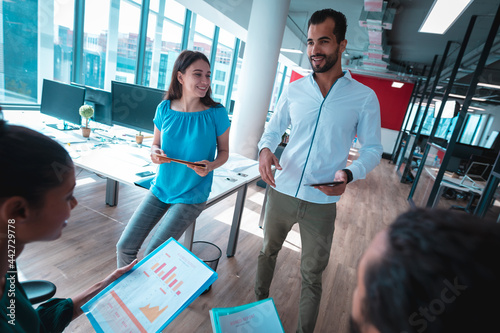 Group of diverse businesspeople discussing together and holding documents