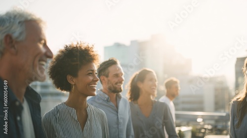 Group of diverse happy young adults smiling outdoors during sunny daytime.