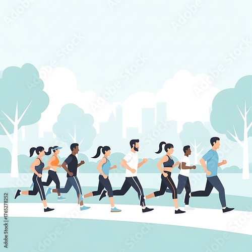 Group of diverse people running together in a park for fitness and exercise.