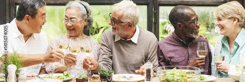 Group of diverse seniors enjoying a meal together, sharing laughter and wine. Elderly friends, diverse gathering, joyful meal, happy seniors, wine glasses. Senior friends drinking with wine for lunch.