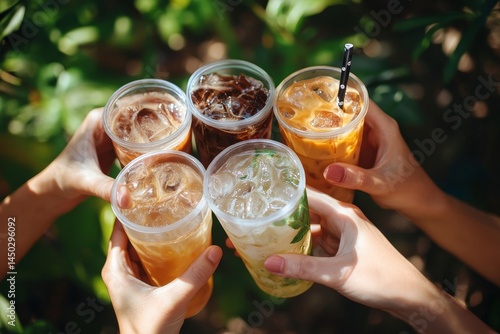 Group of female friends having ice coffee outdoors