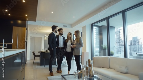 Group of four professionals engaging in conversation while touring a modern apartment in a city during daylight hours
