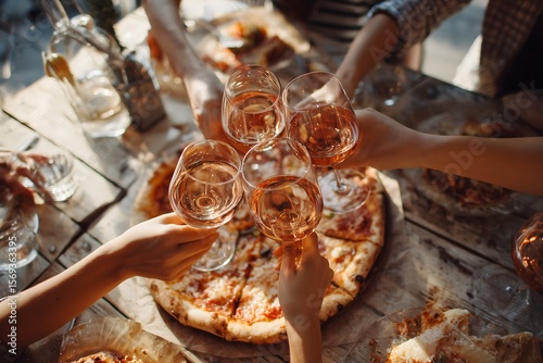 Group of friends enjoying dinner party with pizza and wine toasting together.