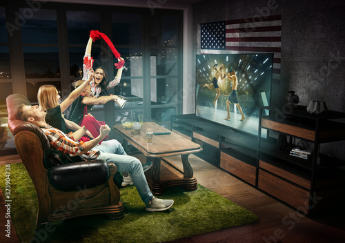 Group of friends watching TV, match, championship, sport games. Emotional men and women cheering for favourite MMA boxer of America with flag. Concept of friendship, sport, competition, emotions.
