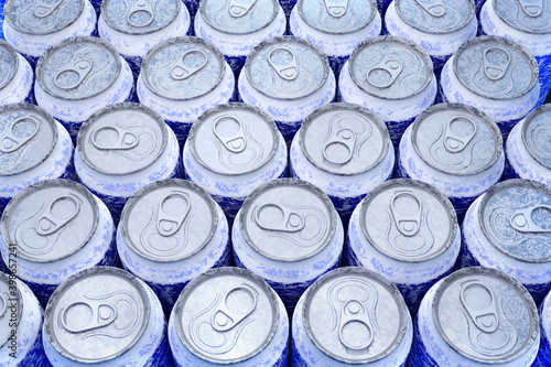 Group of frozen blue aluminum energy drink cans from above close up full frame
