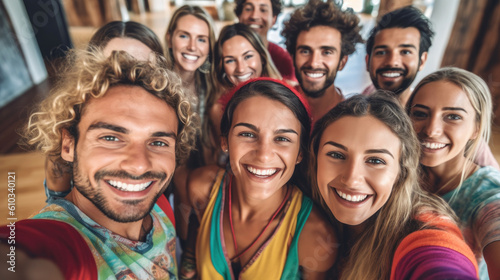 Group of happy people taking a selfie together in a yoga studio. Generative AI