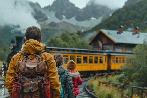 Group of Hikers Approaching Vintage Train Station in Mountainous Region During Overcast Weather