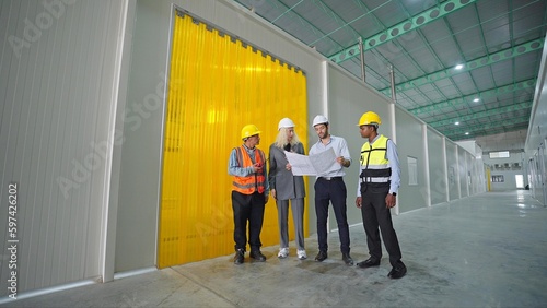 Group of industrial engineers looking project blueprints while standing at large distribution warehouse center