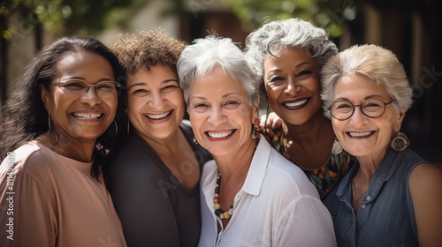 Group of Joyful Senior Women Together. Five senior women, representing a mix of races, smiling warmly in a close-knit group, expressing happiness and companionship.