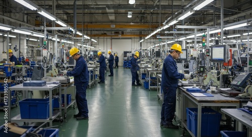 Group of manufacturing workers assembling products in a long production factory line. Industrial business and advanced technology concept.