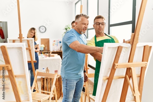 Group of middle age paint students drawing at art studio. Teacher looking student draw.