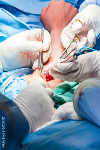 Group of orthopedic surgeons performing surgery on a patient arm