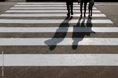 Group of people as daddy-mom-daughter using zebra crossway on concrete road. Light and shadow with pedestrian on traffic sign area and textured on cement ground. Background for safety first concept.