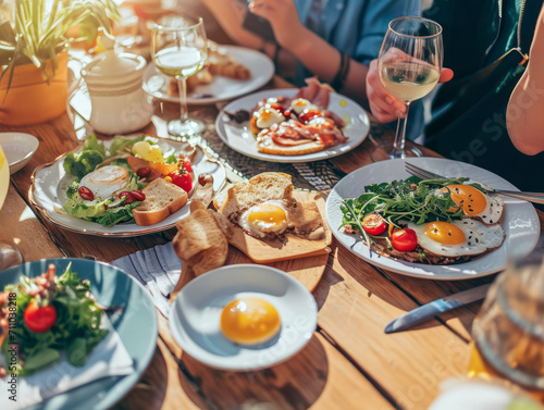 Group of people having breakfast together at home. People sitting at wooden table and eating healthy food.