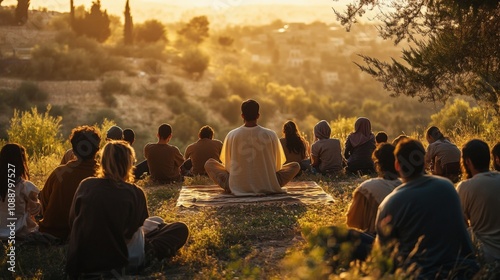 Group of People Meditating on a Hillside at Sunset