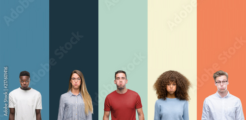 Group of people over vintage colors background puffing cheeks with funny face. Mouth inflated with air, crazy expression.
