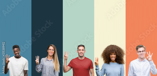 Group of people over vintage colors background showing and pointing up with fingers number three while smiling confident and happy.