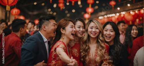 Group of people participating in Chinese New Year festivities. Red lanterns and festive decorations fill the air, creating a vibrant and joyful atmosphere.