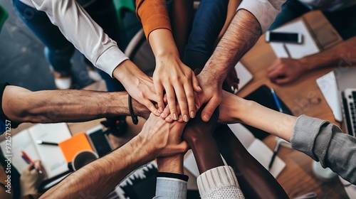 Group of people showing unity and teamwork by placing their hands together on a table.
