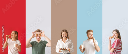 Group of people with tasty cookies on color background