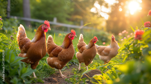 Group of red hens on a farm. Eggs laying chickens in backyard.