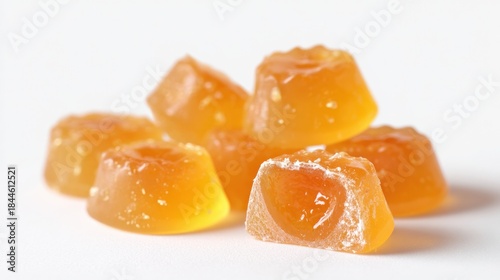 Group of small, square-shaped candies scattered on a white surface. the candies appear to be orange in color and have a glossy texture.