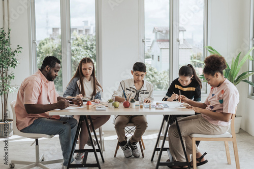 Group of students learning drawing lesson with african teacher in art class. Kids learning art lesson in classroom. Education concept.