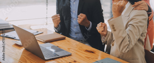 Group of Young Asian business team creative businesspeople coworker in office Happy to be successful partnership teamwork celebrating achievement and success concept.