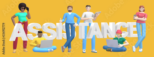 Group of young multiethnic successful people with laptop, tablet, phone and word assistance on yellow background. Horizontal banner cartoon character and text website slogan. 3D rendering.