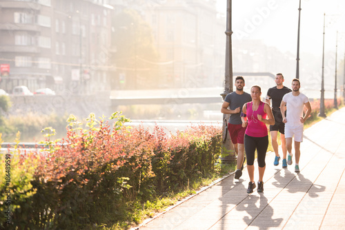 group of young people jogging in the city