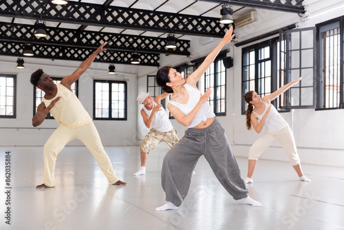 Group of young people learning modern dance movements at class together