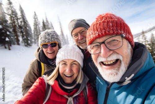 Group portrait of senior friends enjoying a day skiing in the mountains