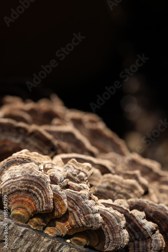 Grouping of mushrooms on a wooden log. Vertical photograph with space for copying.