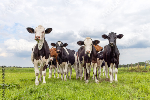 Groups cows black red and white, in a row side by side, front view in a field and cloudy blue sky