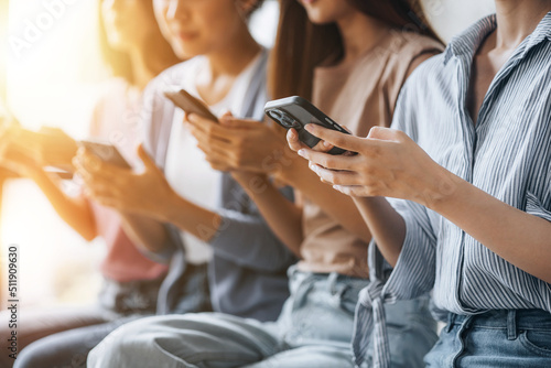 Groups of women sit in a row in the room, playing with cell phones. The concept of using a smartphone communication tool to play social media and send messages to talk to people through applications.