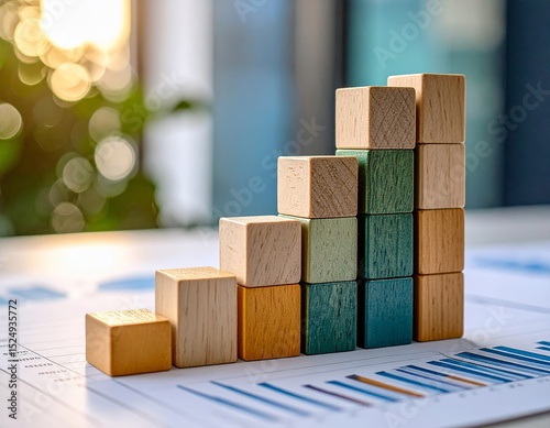 Growth chart. Gathering statistics and analyzing data. Toy block steps on many charts