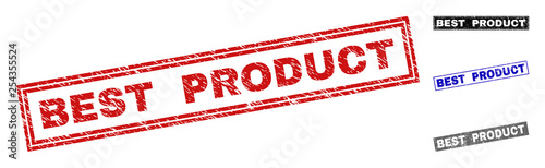 Grunge BEST PRODUCT rectangle stamp seals isolated on a white background. Rectangular seals with distress texture in red, blue, black and gray colors.