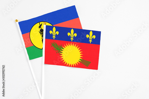 Guadeloupe and New Caledonia stick flags on white background. High quality fabric, miniature national flag. Peaceful global concept.White floor for copy space.