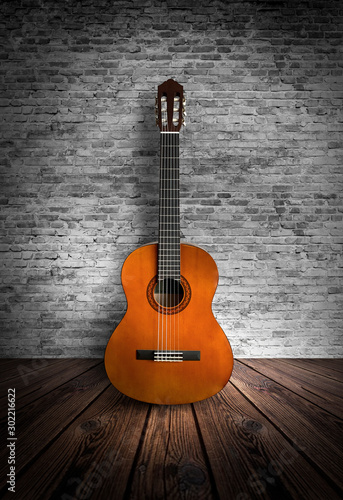 Guitar in a dark room with brick walls, wooden floor. Smoke, abstract light. Dark empty scene with a musical instrument.