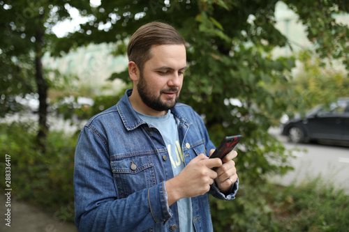 guy in a jeans suit looks at the phone screen