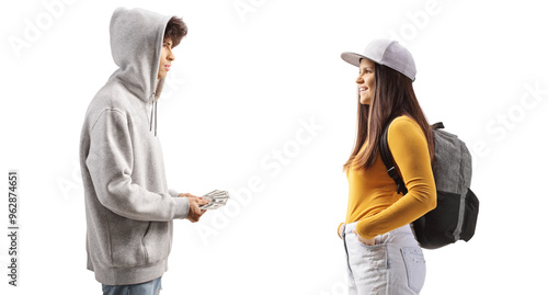 Guy talking to a toung female and counting money