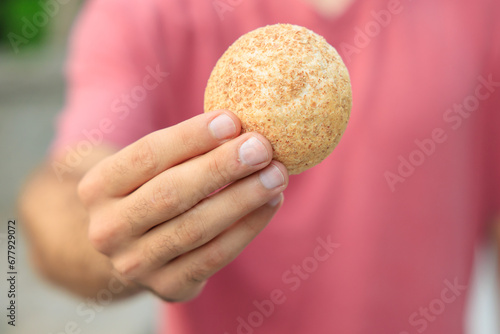 Guy's hand holds mini bread, snack and fast food concept. Selective focus on hands with blurred background