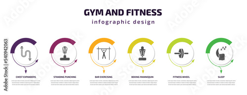 gym and fitness infographic template with icons and 6 step or option. gym and fitness icons such as chest expanders, standing punching ball, bar exercising, boxing mannequin, fitness wheel, sleep