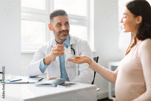 Gynaecology, medicine and pregnancy concept. Male gynecologist giving pills to smiling pregnant woman during appointment