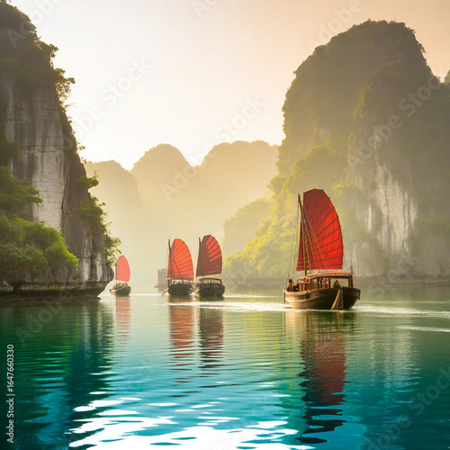 Ha Long Bay, Halong bay World Heritage Site, limestone islands, emerald waters with boats in Quảng Ninh province, Vietnam. Travel destination, natural wonder landscape background wallpapr