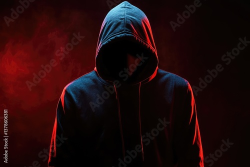 Hacker character in the dark with face obscured by hood under red lighting. AI generated illustration.