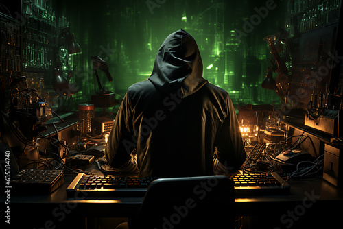 hacker sitting at the computer, cyber security and anti-spyware concept