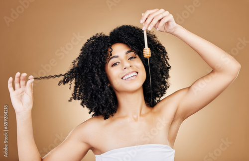 Hair, beauty and portrait of woman with honey, natural care and oil treatment on studio background with happiness. Happy, African haircare and product with honeycomb, moisture and sugar benefits