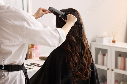 Hairdresser working with client using curling hair iron in salon, closeup