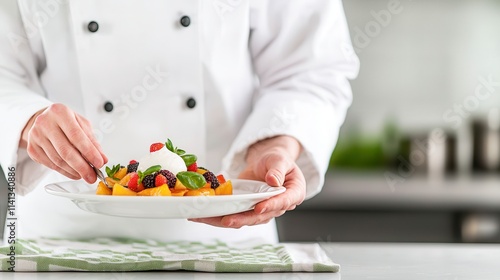 Halal fruits use organic ingredients. Chef plating a colorful dessert with fresh fruits and cream.